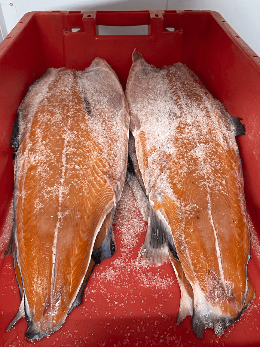 Il pesce viene prima sfilettato, lasciando le lische che verranno rimosse solo quando il pesce sarà affumicato. In questo modo si evita che il fumo penetri troppo in profondità. Il pesce è quindi pronto per la fase successiva, la salatura a secco. Il sale ha due funzioni principali: la prima è quella di conservare e la seconda è quella di condire. La tempistica è fondamentale, poiché una salatura eccessiva può rendere il prodotto finale troppo salato e troppo secco. Dopo la salatura, il pesce viene sciacquato e asciugato all'aria. Il salmone è ora pronto per essere affumicato.