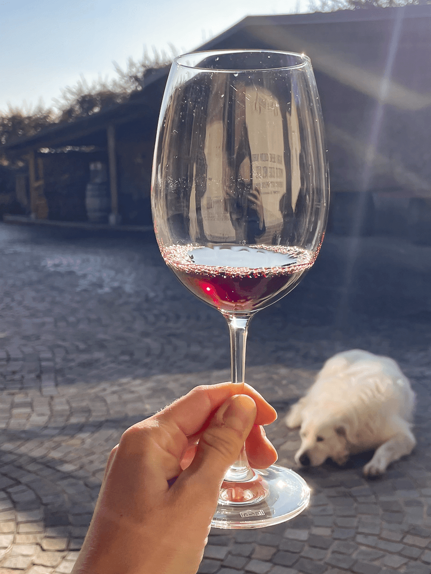 For a few minutes, we sit with Anna and her four-legged friend from the Pyrenees, admiring the sun reflecting in our glasses and on the smooth round red volcanic stone.