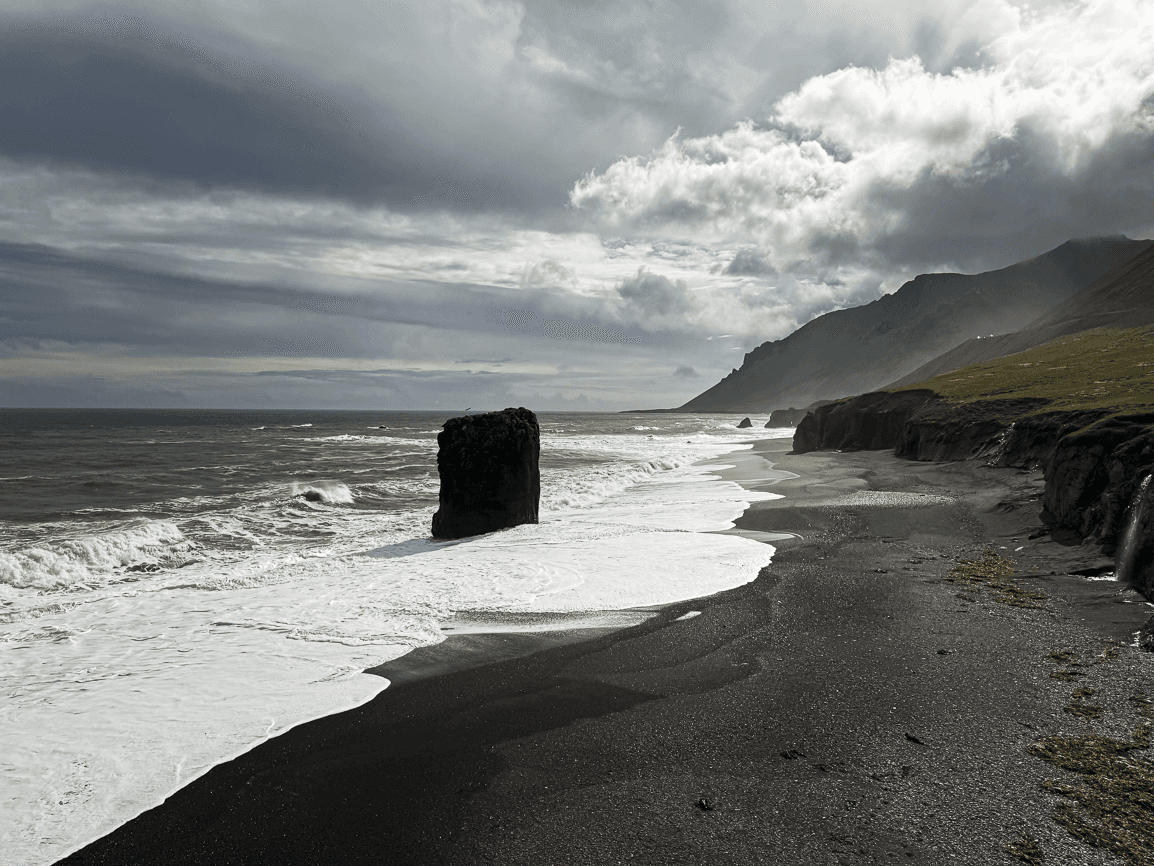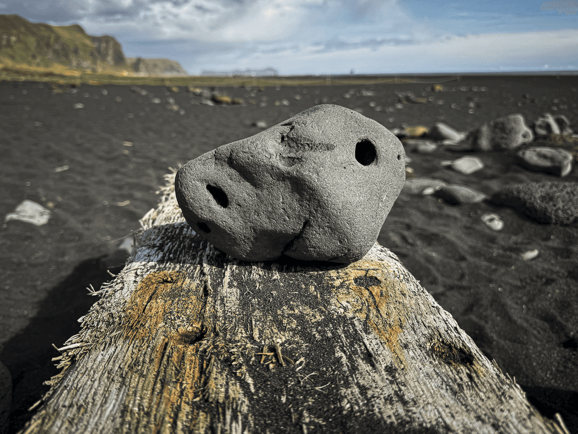 I look for an appropriate place to enjoy it in peace and tranquility, I find the beautiful black beach of Vík, and I sit on a natural bench made from wood carried by the sea. My son, prophetically, even finds a stone shaped like a shark's head. I place it next to me for strength.
